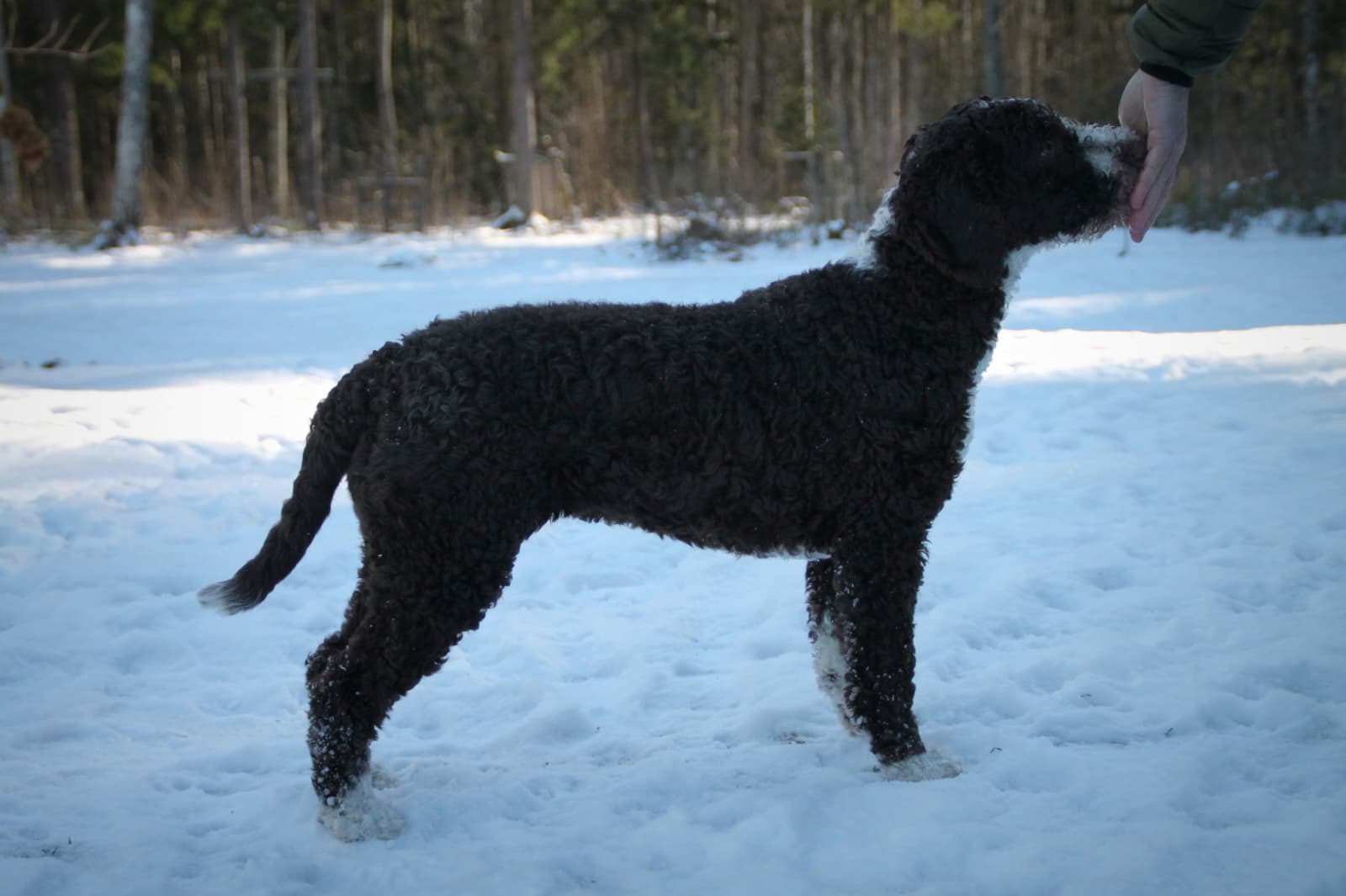 Eipä pitänyt tästä pentueesta jäädä pentua kotiin, mutta minkäs teet, kun pentueen ainoa narttu on vaan aivan pakko pitää - se on niin ihana kaikin puolin ja täydellinen meidän laumaan. Freya oli avoin ja reipas pentu, jolle nenänkäyttö on erittäin mieluisaa. Näin ollen selvisi jo pienenä, että Freyan tulevaisuuden lajit tulevat olemaan näyttelyt ja nose work. Freya menee töpöheiluen tervehtimään ihmisiä ja kaikista eniten se rakastaa kissoja - jopa niin paljon, että meidän kissamme viettivät pitkään aikaa yläkerrassa Freyan ollessa sisällä ja liittyivät osaksi laumaa heti, kun Freya lähti ulos tai oli reissussa ja katosivat taas ylös karkuun jatkuvia rakkaudenosoituksia. Kissamme kun eivät osaa asettaa koirille rajoja, vaan sietävät korvien pesemistä ja koiran leikitystä, tai poistuvat paikalta. Vieraat koirat ovat vähän jännittäviä Freyan mielestä, kuten myös näyttelytilanteessa tuomarit - Freya lukee ihmistä erittäin hyvin, ja kun minua jännittää kilpailutilanteessa, jännitys tarttuu koiraan. Myös mörköikä kesti useita kuukausia, jolloin Freyan mielestä perässä kävelevät ihmiset olivat epäilyttäviä kuten monet muutkin asiat. Onneksi mörköikä väistyi ja iloinen Freya palasi! Kaikki meille kotiin tulevat ihmiset ovat heti Freyan mielestä maailman ihanimpia, mutta kodin ulkopuolella välillä varsinkin väsyneenä alkuun väistelee eli pientä pidättyväisyyttä on havaittavissa.